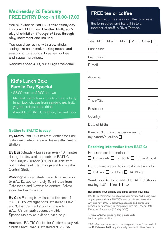 W imieniu Baltic Mill Muzeum chcielibyśmy zaprosić Państwa na Lutowy Dzień Rodzinny, który będzie miał miejsce dnia, 20 lutego (środa) 2019, w Baltic Gateshead Quayside, od godziny 10 rano do 18 po południu.
