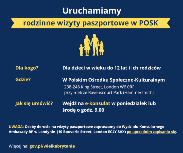 Na rodzinną wizytę paszportową w POSK można umówić się przez elektroniczny system e-konsulat. Nowe terminy będą udostępniane w każdy poniedziałek i środę o godzinie 9:00.
